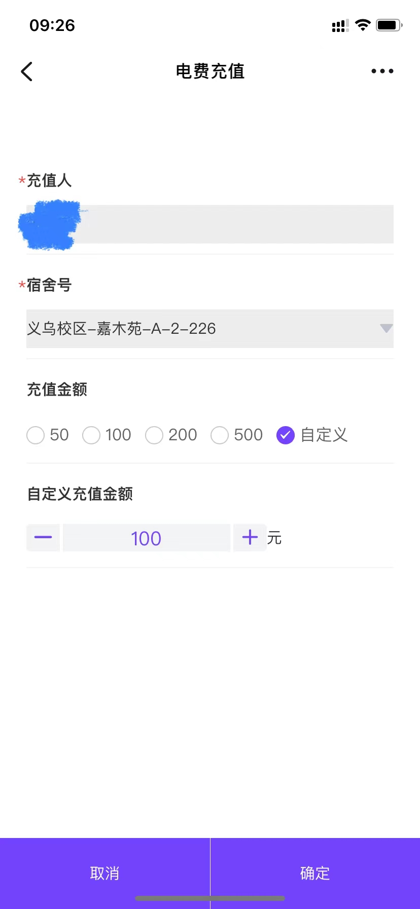 3、点击电费充值按钮,输入需充值的宿舍号和金额后点击确定,然后支付相应金额。