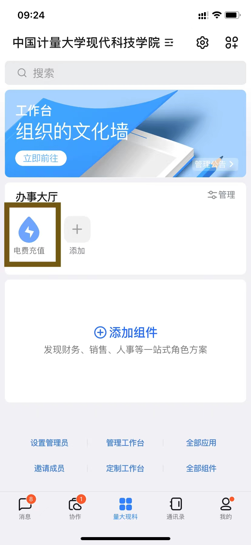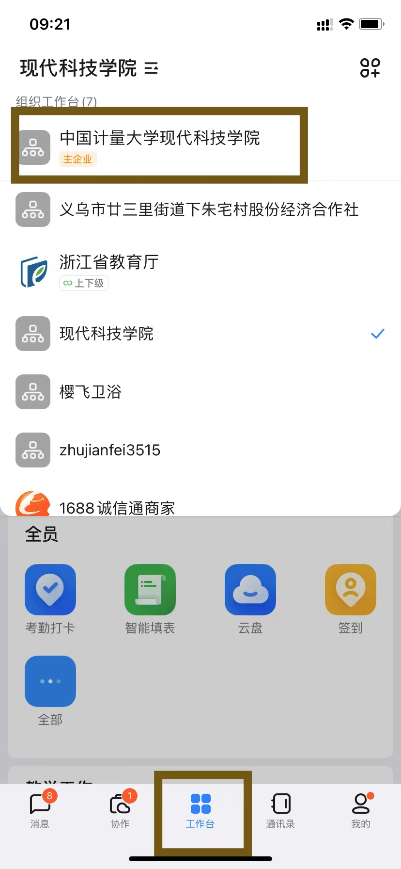 1、进入钉钉工作台,切换到计量大学现代科技学院组织
