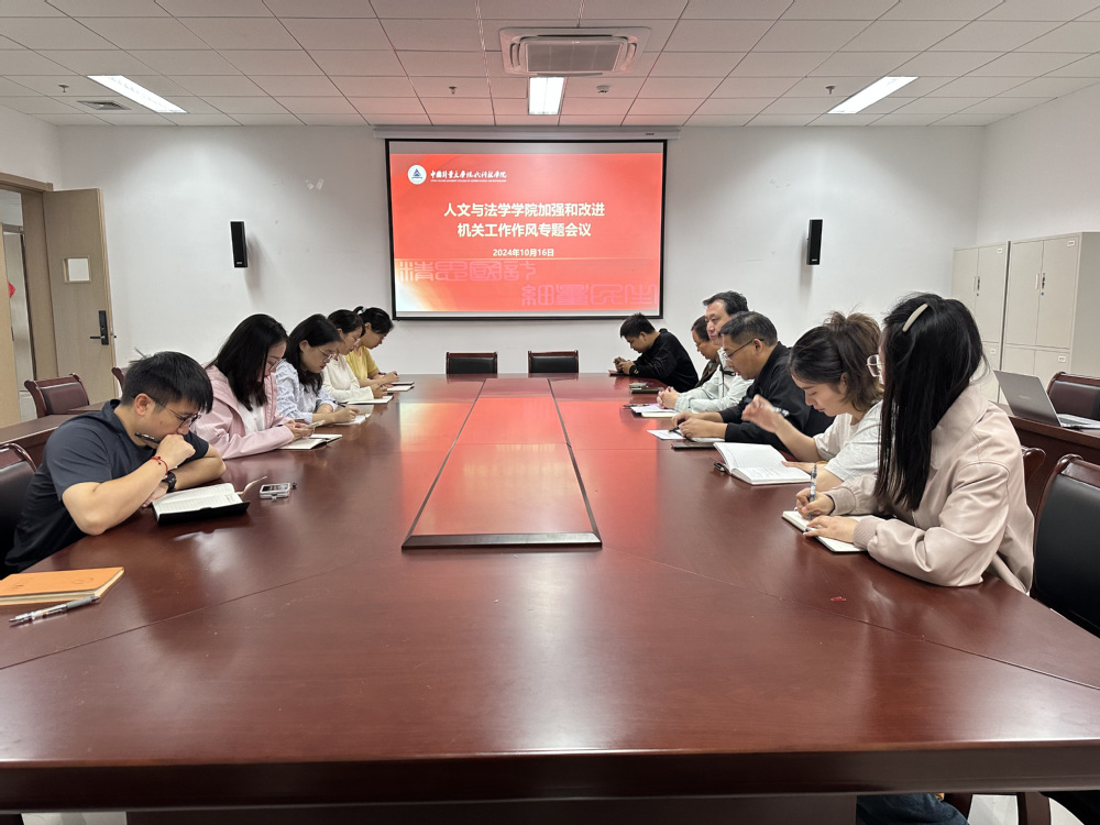 10月16日上午,人文与法学学院召开加强和改进机关工作作风专题会议,学习党的二十届三中全会和全国教育大会精神,学习贯彻现代科技学院关于进一步加强和改进机关作风有关会议的精神,对学院如何改进工作作风进行了研究和讨论。人文与法学学院党政班子成员和全体行政人员参加了会议。