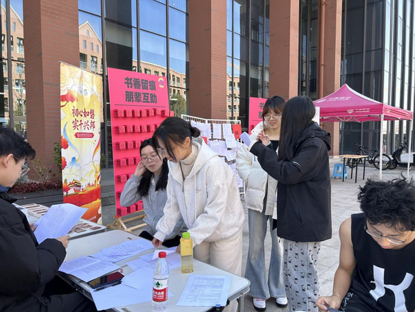 “书香留痕,朋辈互助”主题党日系列活动于学院学生食堂侧门有序开展,以党建育人与朋辈互助为核心导向,设笔记分享、知识问答两大通道,辅以积分兑换激励机制。经多渠道宣传预热,活动现场参与热情高涨、秩序井然,同学们踊跃分享优质备考笔记、参与党建知识问答,领取兼具实用与纪念意义的礼品,在互动中实现知识共享,互助共进。
