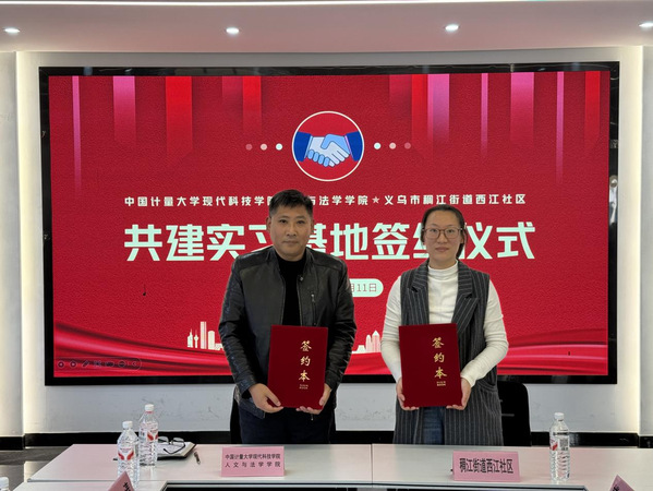 为深化校地合作与协同育人,将高校智力资源精准对接社会基层发展需求,12月11日下午,人文与法学学院与义乌市稠江街道西江社区实习基地签约暨挂牌仪式在西江社区党群服务中心举行。人文与法学学院院长乔浩风、党总支书记孙涛、副院长蒲芳、汉语言专业主管沈晓梅、广告专业主管朱艺洁等学院代表,与西江社区党委书记吴康丽、党委副书记楼珊、党委委员王子怡、王成铭共同出席了本次仪式。