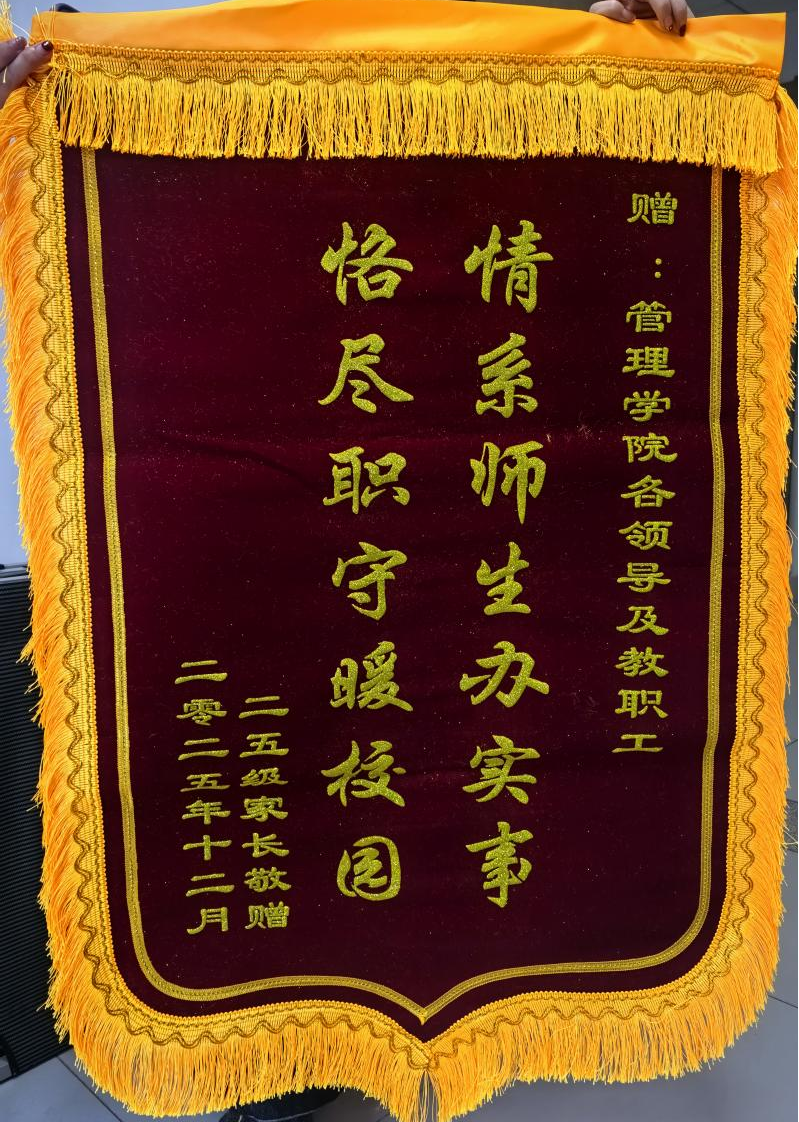 近日,一面印着“情系师生办实事,恪尽职守暖校园”的锦旗,由一名学生家长郑重送到管理学院。鲜红的锦缎、鎏金的字迹,不仅是家长对学院工作的高度认可与真挚感谢,更映照出学校各部门协同践行“以生为本”理念的初心与担当。这面锦旗背后,藏着一段由学院牵头响应、多部门协作解决学生难题的温暖故事。